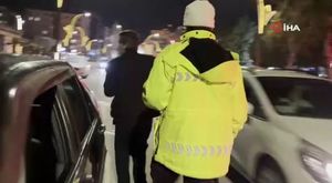 Aksaray'da yasal sınırın 4 katını aşkın alkollü şekilde polise yakalanan ve polis memurlarınca araçtan indirilen sürüc...