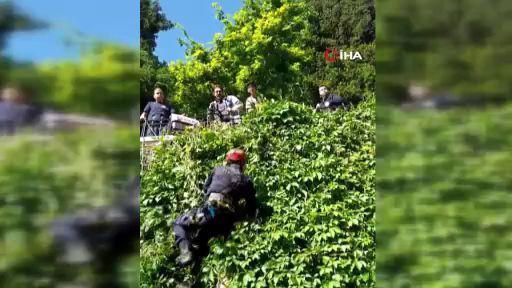Bursa'da sarmaşıkta mahsur kalan kedinin imdadına itfaiye ekipleri yetişti. Ekipler, kediyi mahsur kaldığı yerden kurtardı.