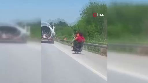 Bursa'da motosiklete 4 kişi binerek kilometrelerce ilerleyen ailenin tehlikeli yolculuğu amatör kameraya yansıdı.
