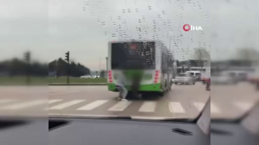 Bursa'da otobüsün arkasına tutunarak ayaklarını yere sürüyen 10-15 yaşlarındaki 2 çocuk, trafikte tehlike saçtı. O anlar cep telefonu kamerasına yansıdı.