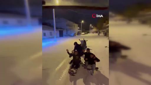 Bursa'nın Yenişehir ilçesinde bir grup genç, traktörün arkasına bağladıkları araç lastiklerine oturarak karda kaydı. Kilometrelerce kayarak ilerleyen gençlerin eğlenceli anları, saniye saniye amatör kamera ile kaydedildi.