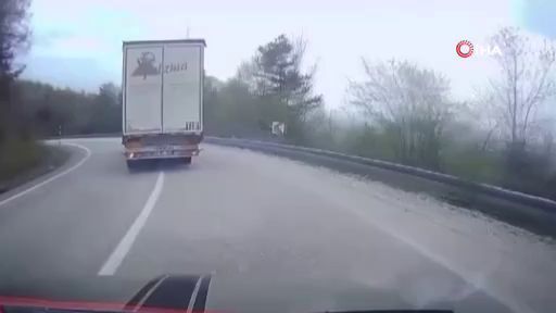 Bursa'nın İnegöl ilçesinde virajı alamayan su yüklü tırın devrildiği kazada sürücü yaralandı. Tırın devrilme anı araç kamerasına yansıdı.