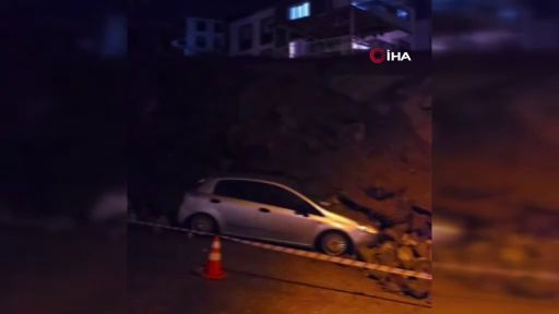 Mudanya’da gece saatlerinde yağışın etkisiyle istinat duvarı çöktü, park halindeki araç kullanılamaz hale geldi.