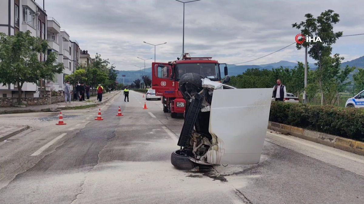 Bursa'nın İnegöl ilçesinde sürücüsünün kontrolünden çıkan otomobil, ağaca çarpıp yan yattı.