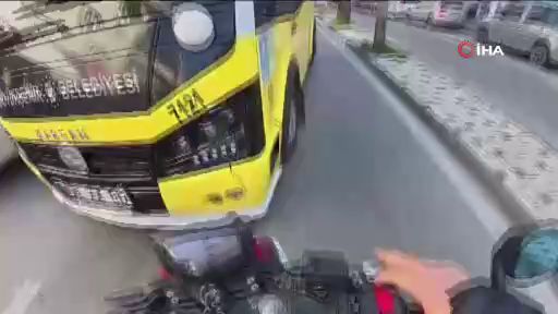 Bursa'da cadde üzerinde ilerleyen motosikletli, yola aniden çıkan kamyonete çarpmamak için manevra yapıp ters yöne girdi. Karşı taraftan gelen otobüse çarpıp durabilen sürücü, facianın eşiğinden döndü. O anlar kameraya yansıdı.